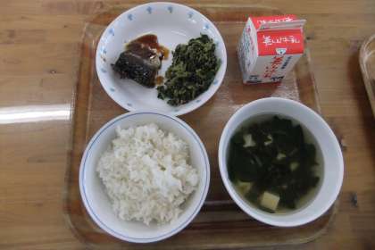 今日の献立は、胚芽米ごはん・牛乳・さばのかわり煮・大根葉のごまいため・すまし汁でした。さばのかわり煮は、トウバンジャンやみそ、しょうがを入れてよく煮込んでいただきました。1年生は、魚の骨をとって食べるのに少し大変でしたが、残さずにみんなきれいに食べられました。