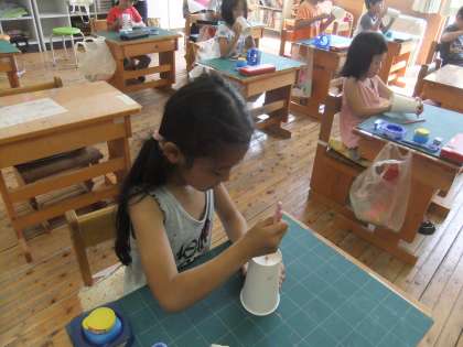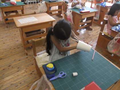 まず,3カ所を決めて紙コップに穴をあけます。