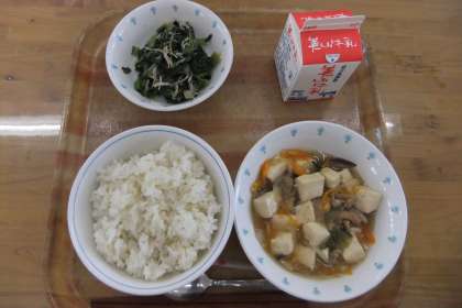 今日の献立は、麦ごはん・牛乳・五目どうふ・小松菜ともやしのいためナムルでした。今日の小松菜は、京北産のものでした。とても新鮮で、シャキシャキとしていておいしかったです。五目豆腐は、とうふがしっかりときれいに仕上がりました。とろりとしたあんがかかっていて、おいしかったです。