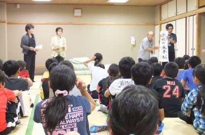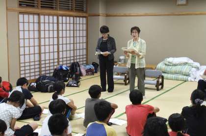 「京北民話の語り部」と題して、「八つ頭の大鹿退治」「寺小屋跡」「京北の五本松」の三つのお話を聞かせてもらいました。京北トレイルでみんなとても疲れていましたが、お話がとても面白く、疲れも忘れて聞き入っていました。
