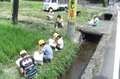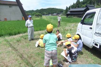 案山子たての後、夏休み中の田の水の管理について、村上さんからお話を聞きました。夏休みには、一人ひとりペットボトルに植えた苗を自宅に持ち帰り、育てます。大きく育ってくれるといいですね。