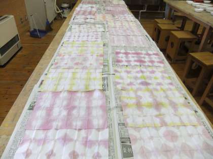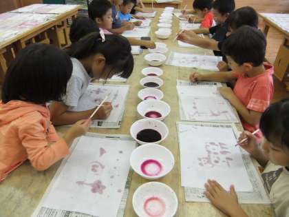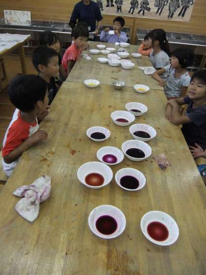 赤紫、青紫、桃色、茶色・・・微妙な色の違いが何とも美しかったです。少しだけマリーゴールドの黄色、山吹色、松葉牡丹の赤色も足して、半紙を染めて遊びました。これは後日、鉛筆立ての飾り紙にします。
