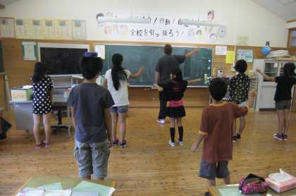 6年生はロバート先生に英語を教えていただいています。この日は,「POST OFFICE」や「PARK」など,いろいろな市の施設の絵カードを使っておはじきゲームをしながら楽しく学んでいます。その後「TURN RIGHT」「TURN LEFT」などの声に合わせて目をつぶって体を回して楽しみました。