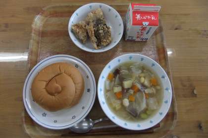今日の献立は、バターうずまきパン・牛乳・あじのこはく揚げ・野菜のスープ煮でした。あじは、しょうがと料理酒、こいくちしょうゆの下味をつけて、粉をつけて揚げました。カラッとさっくり揚がっていて、おいしかったです。野菜のスープ煮は、金時豆・手亡豆・大豆・枝豆が入っていて彩りもよかったです。キャベツやたまねぎの自然な甘みがおいしかったです。