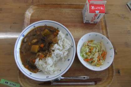 今日の献立は、麦ごはん・牛乳・夏野菜のカレー・野菜ソテーでした。夏野菜のカレーには、地元でとれたかぼちゃ、なすが入っていました。なすが少し苦手だという子どももいましたが、大好きなカレーに入っていたので、残さずにきれいに食べられました。旬の味を味わうことができました。
