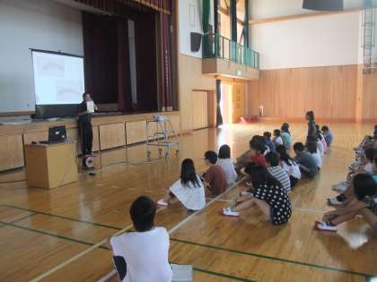 9/13の朝会は桑野先生のお話でした。「思いこみ」「錯覚」をテーマに話されました。ほうきのように見えて,実は大きな筆だったり,きゅうりのように見えて実はボールペンだったり,風に吹かれたピカチューの傾きが,風の方向によって変わったりと,子どもたちにとってちょっと不思議なものを見せられた後,日本中心の世界地図とオーストラリア中心の世界地図では全く描き方が違うことも見せていただきました。こんなふうに,友達の見方,考え方も一方的に見たり決めつけたりするのではなく,いろんな見方をして,その友達のよさを見つけることが大切だというお話でした。友達のいいところ,たくさん見つけ合いましょう。