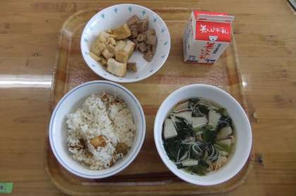 今日の献立は、あげいもごはん・牛乳・なまぶしと厚揚げの煮つけ・すまし汁でした。あげいもごはんは京北献立で、京北でとれたさつまいもをサイコロに切って、油で揚げてごはんに混ぜて二度炊きしていただきました。栗ごはんのように甘みがあって、また昆布だしのうまみもきいていて、おいしかったです。