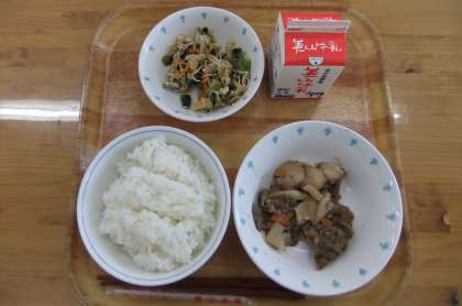 今日の献立は、ごはん・牛乳・芋煮・もやしの煮びたしでした。芋煮は、山形県の郷土料理です。給食では、牛肉・にんじん・里芋・白ねぎ・しめじ・こんにゃくをさとう・みりん・料理酒・しょうゆの煮汁でじっくり煮込みました。里芋がとろっとしていて、いろいろな食材をやさしく包み込んでいて、とてもおいしかったです。