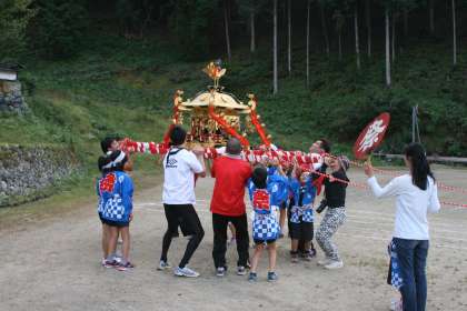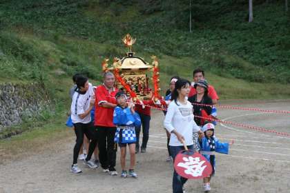 子どもみこしで旧黒田小学校の運動場を練り歩きました。