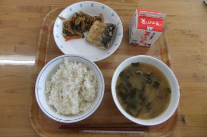 今日の献立は、麦ごはん・牛乳・さばのたつたあげ・野菜のきんぴら・みそ汁でした。さばのたつたあげは、しょうが・料理酒・薄口しょうゆで下味をつけたものに片栗粉と小麦粉をまぶして油で揚げました。あぶらがのっていて、ジューシーでとてもおいしかったです。京北みそを使ったみそ汁も風味がよくておいしかったです。