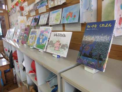 ロッカーの後ろに、みんなのお気に入りの本がずらりと並んでいます。これからもいろんな本に親しんでほしいと思います。