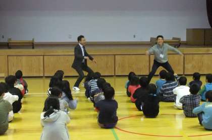 朝会の後,校長と教務主任で算数クイズをしました。