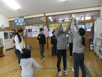 「雪がつもったら校庭にお店を開こう」と計画しました。図画工作科の造形遊びです。支柱で骨組みを作ってビニールをかぶせるとおうちができます。さらにすてきなおうちになるように、みんなで絵をかきました。雪の降る日が楽しみです。