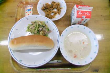 今日は、6年生お楽しみ給食の日で、コッペパン・ハムサンドの具・牛乳・コーンチャウダー・豚肉のケチャップ煮でした。いつもの給食に、豚肉のケチャップ煮を一品追加しました。キャベツとたまねぎ、ハムを炒めた具をパンにはさんで食べると、とてもおいしかったです。コーンチャウダーもやさしい味でおいしかったです。全校で6年生に今までお世話になったことを感謝しながらいただきました。