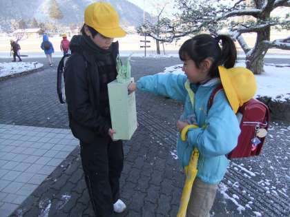 1年間みなさんにお世話になった福島への支援活動の残金を、社会科で学習した「国際連合児童基金・ユニセフ」へ募金することにしました。あわせて、再度ユニセフへの募金活動をすることにしました。