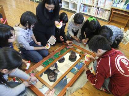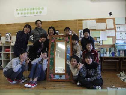 予算が合わなかったり、板のサイズが合わなかったり、枠にボンドがついていて色がつかなかったり・・・といろいろハプニングがありましたが、やっと完成しました。最後はみんなで笑顔の記念写真。また1つ思い出ができました。