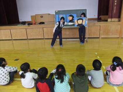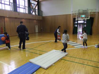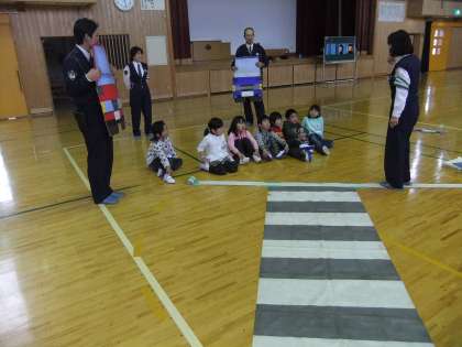 全校での登下校を始めた1年生。安全に行き帰りできるように、4人のおまわりさんが来てくださっての交通安全教室がありました。道の歩き方、横断の仕方、気をつけることなど、分かりやすい絵でお話を聞かせていただいた後、実際に道に見立てた体育館を歩いてみました。突然走ってくる自動車(おまわりさん)や曲がり道、交差点に気をつけながら、手に持ったボールを落とさないように上手に歩くことができました。