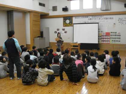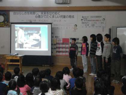 1月22日 今日の朝会では,図書委員会が全校に図書室の本の取り扱いについてお願いをしました。日頃の図書室の使い方で気になっていることを図書委員会がビデオに撮り,全校に訴えました。図書委員会の子どもたちが正しい返し方の手本をスクリーンを通して映し,説明しながら話しました。本はみんなのものです。大切に読みましよう。