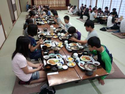 豪華な夕食です。みんなもりもり食べていますが、結構量が多いので、なかなか食べきれないようです。お肉にカツに魚茶碗蒸し、味噌汁、デザートです。これから、夜景を見に出かけます。