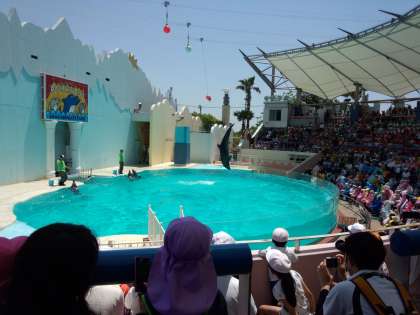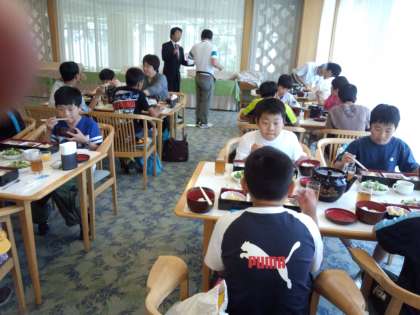 11時からのイルカショーを見ました。水がかかるゾーンに座った子どもたちもいました。水族園から、海岸を歩いてシーバス須磨に行き、最後の昼食を取りました。いよいよ、最後の目的地、大阪です。