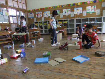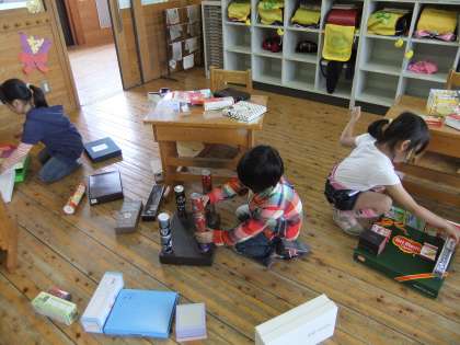 おうちの方にも協力していただいて、いろいろな形の箱をたくさん集めました。今日はその箱の形を活かして動物や乗り物などを作りました。筒の形を首に見立てて動物を作ったり、平たい箱をおうちの壁に見立てて家を作ったり・・・といろいろ作って楽しみました。