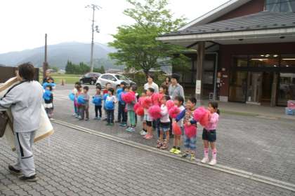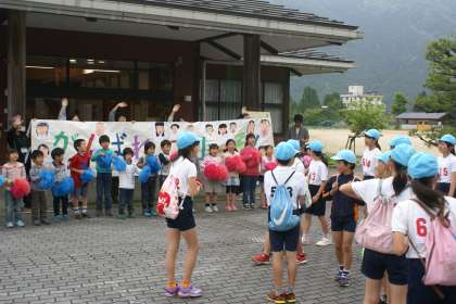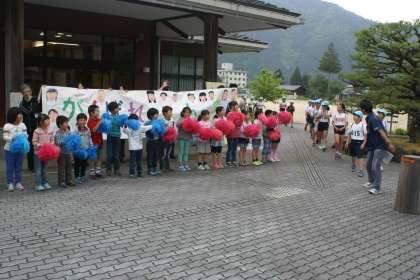 京北地域陸上交歓記録会が第一小学校で行われます。1・2年生が作った応援横断幕で5・6年生を送りました。5・6年生頑張ってきてください。