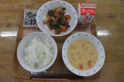 今日の献立は、ごはん・牛乳・焼肉・トマトとたまごのスープ・じゃこでした。焼肉は、キャベツやたまねぎ、ピーマン・にんじんなどの野菜がたっぷり入っていました。ピーマンがちょっと苦手と言っている子どももいましたが、残さずにがんばって食べられました。じゃこもポリポリとよくかんで食べられました。