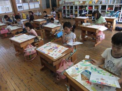 春にわらびやよもぎを摘んだ時のことを絵に描きました。摘んでいるときの姿勢や、周りの様子を思い出しながら描きました。