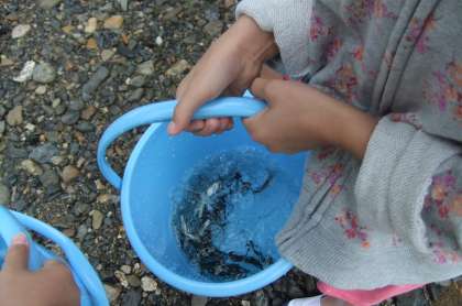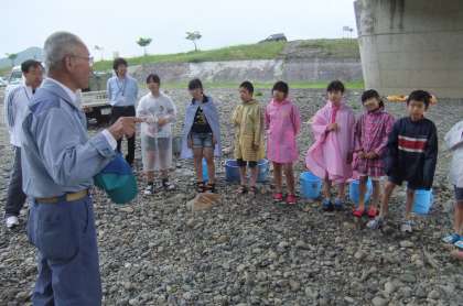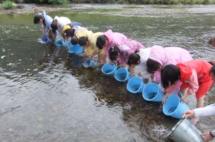 あいにくの天気でしたが,中江橋まで鮎の放流に行きました。ピチピチ斗元気のいい稚魚をバケツに入れてもらい,川に入りました。そしてそっとバケツを傾けると稚魚たちは勢いよく川の中へ。放流の後は,漁業協同組合の方からお話を聞きました。きれいな川にしかいないカジカ蛙がこの上桂川にいること,水を大切にすることについてお話を聞きました。最後に鮎の食べ物や雌雄の違い,鮎の大きさ,川鵜から鮎を守る工夫など質問に丁寧に答えていただきました。放流した鮎が大きく育つといいですね。