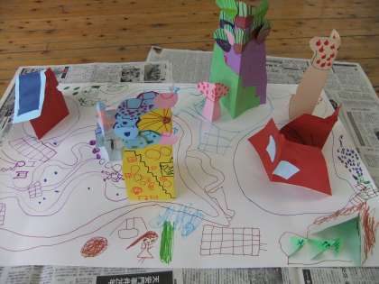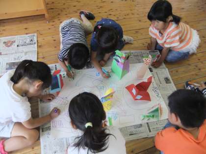 どうすれば紙を立たせることができるかな?立て方を考えた後、紙の切れ端で確かめました。そして、それを使って、最後にはみんなの作品を集めて「ゆめのまち」ができるように、1人1人が作品を作りました。家、ビル、山、木、観覧車など、それぞれが創造を広げました。