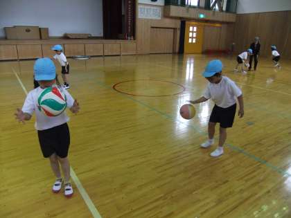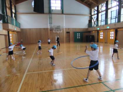 輪やボールなどを使ってさまざまな遊びをしています。輪では、フラフープをしたりキャッチボールをしたり、回転をかけて転がして自分のところに戻ってくるようにしたり、なわとびのようにとんだり・・・・。ボールは、1人キャッチボール、2人キャッチボール、手まり・・・。初めはぎこちない動きだったのにすぐに上手になるのはさすが1年生です。