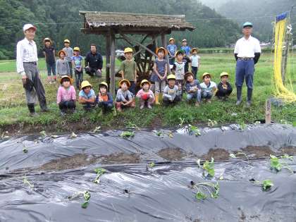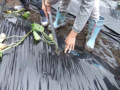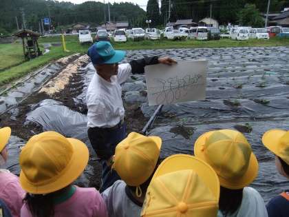 今年も「くろやま塾」の方にお世話になって、1,2年生でいもなえ植えをさせていただきました。サツマイモがどのように大きくなるか絵を使って教えていただき、秘密兵器のアイテムでどのように植えるか説明していただいた後、みんなで植えていきました。以前は1本1本穴を掘って、なえを横に寝かせて、土をかけて・・・と時間がかかりましたが、くろやま塾の秘密兵器のおかげで、子どもたちでも上手に手早く植えることができました。その後みんなで植えたサツマイモに「早く大きくなあれ」と水をかけて完成です。土を耕したりマルチをかけたり教えていただいたり・・と、くろやま塾の方々には大変お世話になりありがとうございました。秋には、収穫したサツマイモで全校焼きイモ大会を予定しています。また、おイモ掘りにはお世話になりますが、よろしくお願いします。