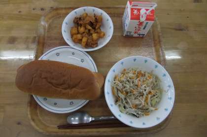 今日の献立は、味付けコッペパン・牛乳・豚肉のケチャップ煮・たっぷり野菜のビーフンでした。たっぷり野菜のビーフンは、キャベツや人参、もやし、しいたけなどの野菜がたっぷりと入っていました。ビーフンが野菜やチキンハムのうま味をよくすっていて、おいしかったです。