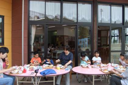 今日は、初めて一年生がテラスで給食を食べました。外の気持ちよい空気を感じておいしくいただきました。こどもたちもとても喜んでいました。