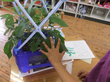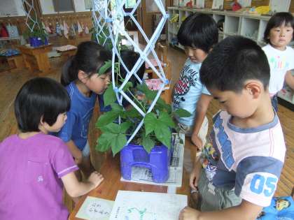 育てているアサガオのつるが伸び、先週は支柱を立てたり肥料をあげたりしました。今日はさらに観察して、前と違うところを見つけました。「葉っぱのとげとげにさわったら、ざくっと音がするよ。」「葉っぱがさらに大きくなったよ。自分の手のひらより大きいよ。」「つるのところに葉っぱの赤ちゃんがついてるよ。」「葉っぱに穴が空いてるよ。虫に食べられたんだね。」「虫を食べてくれるクモやカマキリはアサガオの味方だね。」「つるの巻き方がみんな同じ向きだね。」「巻いてないつるも同じになるのかな?」と、たくさんの発見ができました。