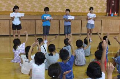 今日の朝会は,総務委員会からの発表,達吉コンビの算数クイズ正解者表彰,サッカーボールの贈呈式,保健給食委員会からのお知らせでした。郵便局からサッカーボールをいただき,みんな大喜びでした。大切に使ってほしいです。