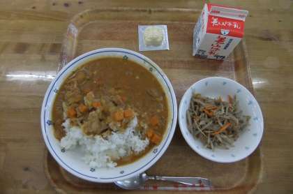 今日の献立は、ごはん・牛乳・チキンカレー・ごぼうのソテー・型チーズでした。ごぼうのソテーは、太いごぼうでしたが、包丁でとても細かい千切りにしていただいたので、ふわっとした口当たりで、ごまの風味もよくとてもおいしかったです。手作りのルーのチキンカレーは、チキンや野菜のうまみがよくとけこんでいて、とてもおいしかったです。