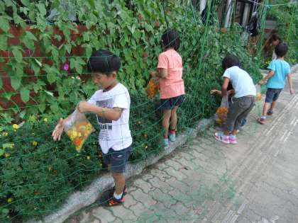 運動会の時の衣装を染めるために植えたマリーゴールドを、みんなでつみました。花を持って引っ張るとポキポキ気持ちいい音を立ててつむことができます。ときどきシカよけのあみに引っかかったりしながら、「ポキポキ」が楽しくて、みんなで競争のようにつみました。