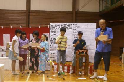 黒田まつりは体育館で行われました。練習した音頭を皆さんに披露しました。