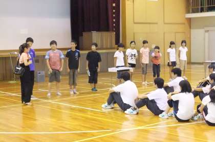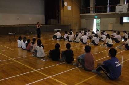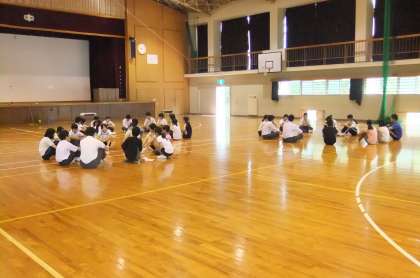 8月21日(木)、周山中学校で行われた「リーダー研修会」に、本校6年生女子3名が参加しました。これは、京北小中一貫教育の一環として、周山中学校の取り組みに3小学校の6年生児童が参加して、交流しようと言うものです。初めに全体の場で3小学校の6年生児童が自己紹介をして、その後グループ毎に分かれ再度自己紹介をしました。