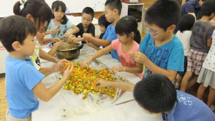 1,2,3年生は運動会で「よさこい 鳴子おどり」を踊ります。その時の衣装に使う帯を、春から育ててきたマリーゴールドで染めました。