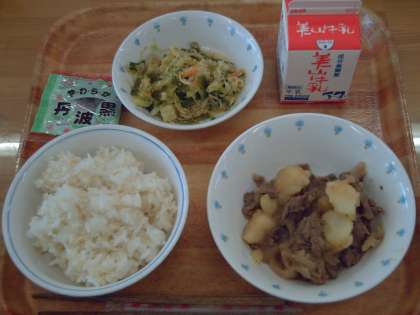 今日の献立は,玄米ごはん・牛乳・肉じゃが・ごま酢煮・黒大豆でした。玄米ごはんは,香ばしくておいしかったです。ごま酢煮には,野菜の他に茎わかめやしらす干しなどが入っていてごはんによく合いました。