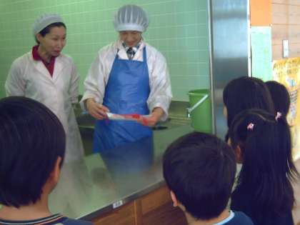 一年生が調理の先生に「いつも,おいしい給食をありがとうございます」と感謝のお手紙を書いて渡しました。調理の先生も「とてもうれしいです。またおいしい給食作りをがんばります。」と言っていただきました。