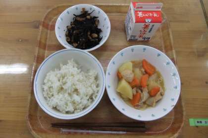 今日の献立は,麦ごはん・牛乳・鶏肉と野菜の煮つけ・ひじき豆でした。鶏肉と野菜の煮つけは,鶏肉のうまみやたまねぎのうまみがじゃがいもやにんじんにしみこんでいて,やさしい味でとてもおいしかったです。ひじき豆はほのかに磯の香りがして,ごはんによく合いました。