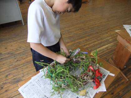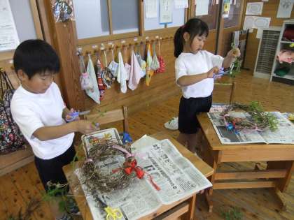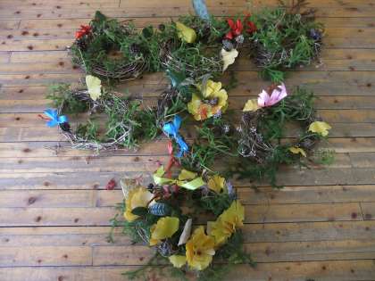 きのう集めた森の恵みを使って、リースのかざりつけをしました。思い思いにきつねのしっぽをつけたり、まつぼっくりをつけたり、きれいに色づいた葉っぱをつけたりして、すてきなリースができました。