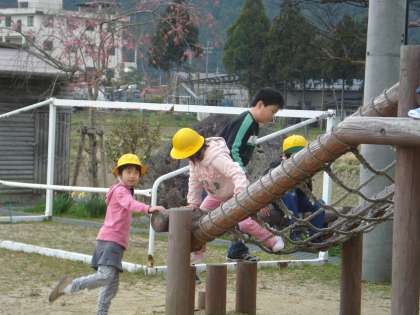 中間休みに木製遊具で遊ぶ1年生。