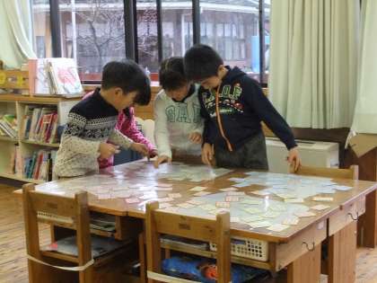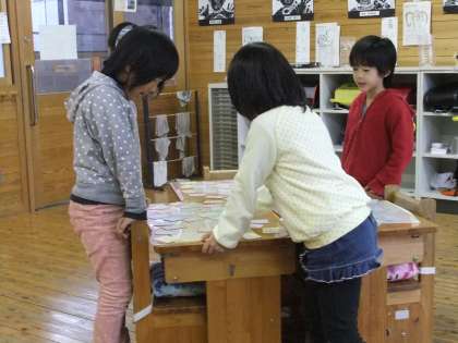 12月に入ってから、百人一首を楽しんでいます。初めは普通のカルタのように初めの音だけを覚えて「ひ、ひ、ひ・・」と探して採るので、全然違う札を取っていましたが、回を重ねるごとに歌として覚えて取ったり、上の句と下の句を区別して取ったりできるようになってきました。班の仲間と協力して、取り残す札も少なくなってきました。早帰りの木曜日には「今日はおうちに帰ったら、お父さんと百人一首するねん。」と楽しそうに話す子もいました。