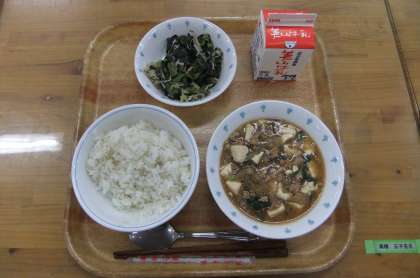 今日の献立は,麦ごはん・牛乳・マーボー豆腐・ほうれん草ともやしの炒めナムルでした。マーボー豆腐は,とうふを丁寧に煮ていただいて,つぶれずにとてもきれいに仕上げていただきました。青ねぎの風味がよく,とてもおいしかったです。