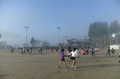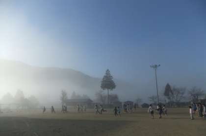 今日の気温は7時20分現在マイナス3度。とても寒い朝です。全校遊びも霧の中で行いました。子どもたちは寒さに負けず,元気いっぱい走り回っていました。