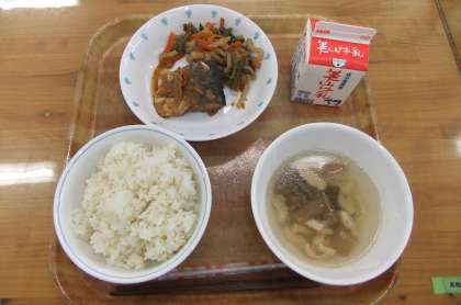 今日の給食は,麦ごはん・さばのみそ煮・野菜のきんぴら・ずいきのくずひきでした。さばは,九州産の寒さばで,ちょうど旬の時期なのであぶらがのっていてとてもおいしかったです。子どもたちは,上手に骨だけをとって食べていました。ずいきのくずひきは,しょうがの風味で,ずいきの歯ごたえもシャキシャキとしていておいしかったです。